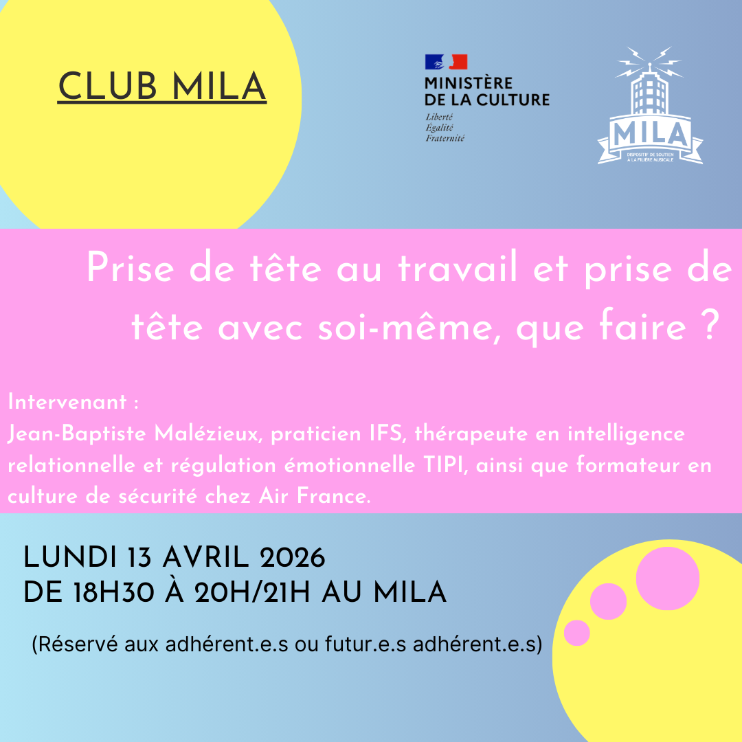 Le CLUB MILA a lieu tous les premiers lundis du mois avec un intervenant extérieur sur une thématique liée à la filière musicale et plébiscitée par les adhérents.